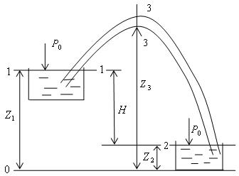 Определить вакуум в верхней точке сифона на высоте Z = 27м и найти расход воды в трубе диаметром d1 = 100мм, если свободные поверхности воды в резервуарах расположены на высоте Н1 =25 м и Н2 = 20м по отношению к плоскости сравнения 0-0. Длины участков соответственно равны l1 =200м и l2 = 200м. При расчете принять Местные гидравлические потери не учитывать.